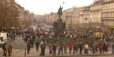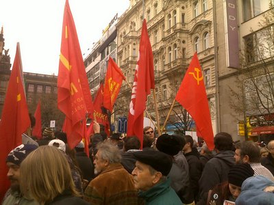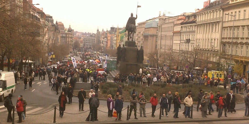 Na Václavském náměstí v Praze se u příležitosti státního svátku 17. listopadu konaly protivládní demonstrace platformy Stop vládě a skupiny Skutečná Demokracie. Někteří ze zhruba 20 tisíc lidí zvonili klíči a zároveň nesli symboly Sovětského svazu.