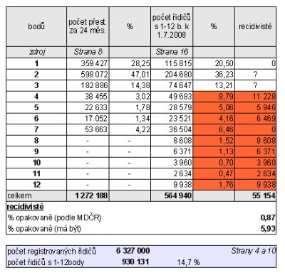Relativně složitější a méně proniknutelný je argument druhý. Plná verze rozboru MDČR obsahuje různou směs dat, navíc ještě vztažených na různá období. Je jich tam tolik, že snadno ztratíte přehled a s tím patrně autoři tak trochu počítají. Je tam počet bodů udělených ženám, mužům, cizincům, snad tam chybí jen stratifikace podle délky penisu. Řekněme si raději, co musí řidič udělat, aby měl na kontě šest bodů. K získání šesti bodů je třeba zavinit nehodu anebo v obci třikrát překročit rychlost o méně než 10 km/h. Je tedy jasné, že počet řidičů s šesti body bude vyšší než počet šestibodových přestupků. U řidičů s deseti body je to pak úplně jasné, tam se musí jednat o recidivu vždy, protože desetibodové přestupky neexistují. Počet recidivistů je tedy dán rozdílem počtu přestupků určité váhy a počtu řidičů se stejným počtem bodů. Například šestibodových přestupků bylo zaznamenáno 17.052, ale řidičů s šesti body je 23.521, to znamená, že 6.496 řidičů se muselo dopustit alespoň jedné recidivy. Podívejme se na tabulku, kterou jsem vyrobil z údajů různě rozptýlených ve zprávě MDČR:
