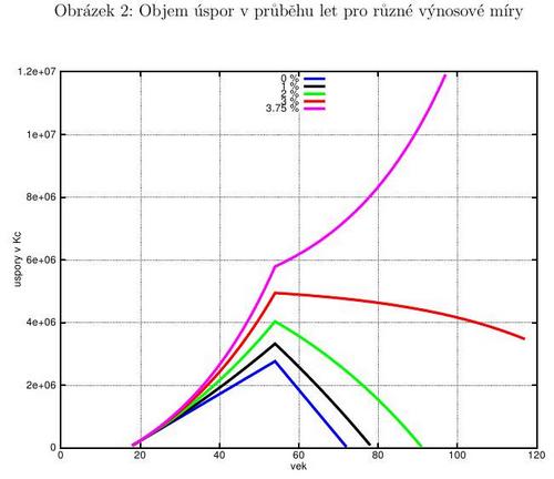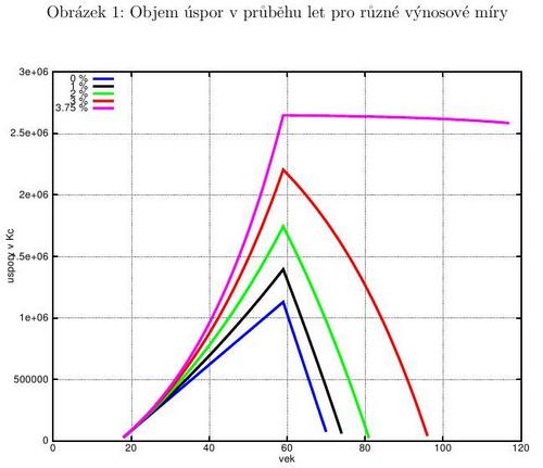 Situace se ukáže být mnohem příznivější, pokud začneme kalkulovat s nenulovým výnosem. Pro ten účel si označíme objem úspor v nějakém roce jako s_k, reálný výnos jako i, roční příjem jako Y a poměr ročních odvodů a ročního příjmu (0.28) jako r. Potom dostaneme za určitých neškodných zjednodušení následující posloupnost pro výši úspor v letech před a po odchodu do penze.