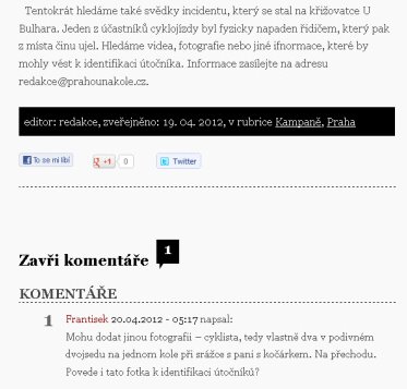 Video s utrženým předkem cyklojízdy (čas 1:30). V čase 2:30 projede Octavia, která pak zablokovala přechod.