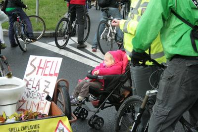 Také se vyskytli náhodní (nikoli pseudonáhodní) chodci, kteří chtěli přecházet. Bohužel nyní již zcela zpitomělí pumpičkáři je považovali za součást akce a najížděli i do nich. Zaznamenal jsem ženu ve formálním oblečení, která k nám nepatřila a která přišla do kontaktu s předním kolem nějakého gaybajku. Náš fotograf zachytil bohužel další a mnohem drastičtější scénu, kdy změť těl, trubek a hudebního nástroje najížděla do „golfek“ s dítětem (matka samozřejmě účastníkem akce nebyla). V souvislostí s touto prasárnou ohleduplných a kytičkovatých cyklofašistů podáme oznámení přestupku, protože tohle cyklofašistům trpět nebudem. Toto byl asi nejkritičtější moment celé události.
