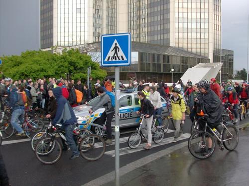 Po nějaké době, kdy jsme se už sami chystali akci ukončit, nám silové složky nadělily neočekáváný bonus. Kordonem cyklofašistů se se zapnutými majáky prodrala policejní Octavia Combi. Její posádka s udivující neprofesionalitou zastavila svoje AUTO uprostřed přechodu a jala se provádět blokádu cyklojízdy sama. Nevěřícně jsem zíral na tuto veřejnou demonstraci ehmmm… nepochopení situace ze strany Policie České republiky. Pomoci a ochránit účastníky cyklojízdy tím, že jim postavíme do cesty auto, ano, to je nápad, který se může vylíhnout v hlavě jen a pouze dopravnímu policistovi. Také mi to připomnělo bezpečnostní program indonéské vlády, která hodlá srážet ilegální cestující ze střech vlaků pomocí betonových koulí, protože jinak by se jim při jízdě na střeše vlaku mohlo něco stát.