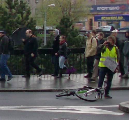 Po nějaké době dorazila vlastní cyklojízda. Podobně jako posledně mě zaujalo, že jednotliví její účastníci jedou jakoby duchem nepřítomni, prostě šlapou a sledují anus před sebou. Poněkud to připomínalo finální výjev z Krysaře. Naprosto mi uniká, jaký druh vyžití je s takovou akcí spojen, nejspíš jde jen o pocit sounáležitosti s dalšími podobně postiženými jedinci a zvrhlá radost z toho, že můžou kolektivně někoho omezovat a vnucovat mu, co má dělat. Podle plánu jsme nechali projet čelo kolony tvořené motocykly a policejními auty. Jakmile byl policejní doprovod na mostě a v takové vzdálenosti, která spolehlivě znemožnila otočení a návrat policejních vozidel (navíc zašpuntovaných čelem cyklojízdy), přikročili jsme k vlastní obstrukci.