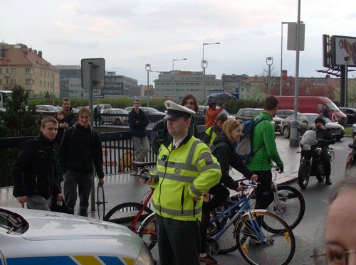 Ještě větší katastrofa bylo účinkování Policie České republiky. Když pominu ten taktický omyl, kdy policie vhodným umístěním vozidla podpořila naši blokádu, nelze akceptovat, že policie podporuje akci, na které je hromadně porušován zákon o provozu na pozemních komunikacích. Jak může policista nečinně přihlížet tomu, že cyklofašisté najíždějí na chodce, a to nejen na pseudonáhodné chodce, ale také na ty, u kterých je očividné, že s akcí nemají nic společného. Na policistech bylo dost silně poznat, co si o akcích cyklofašistů myslí a jak jsou rádi, že mohou být zatahování do těchto sporů, ale jak správně poznamenal Karel, když se jim to nelíbí, ať si najdou jinou práci. Zvažujeme podání stížnosti na oba přítomné policisty, ne že by nám jejich pasivita a porušování zákona o policii principálně vadily, ale proto, aby zchladla ochota policie i jednotlivých policistů podílet se na pololegálních akcích cyklofašistů.