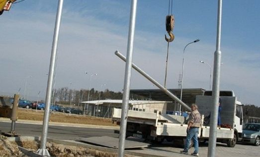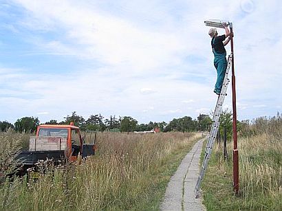 Vhodný sloup jsme získali na sklonku léta od nejmenované středočeské obce. Byl původně součástí lampy, která osvětlovala téměř neužívanou panelovou stezku. Ta spojovala obec a blízkou železniční stanici. Vedení obce bylo rádo, že ten krám někdo odmontuje a dokonce nám za pár stovek dalo k dispozici technika s multikárou, který odmontoval světlo, odpojil elektřinu a poskytl pomoc s vytržením lampy ze země. Naštěstí lampa nebyla moc dobře zabetonovaná a stačilo jí vyviklat.