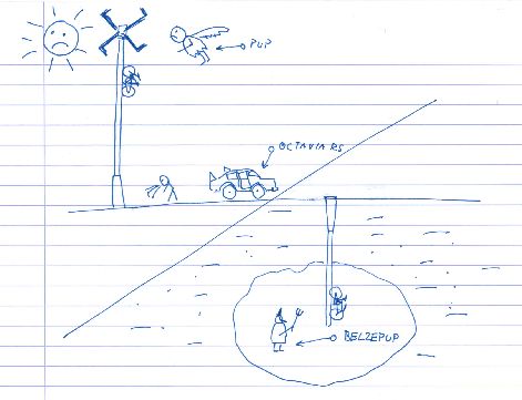 Prvním krokem v realizaci památníku zvaného pracovně Bike2Hell byla kolektivní prohlídka současného díla Bike to heaven výtvarníka Kintery. Výpravy, která jinak nic nového nepřinesla, se účastnil náš spolupracovník z UK. Po prohlídce sloupu řekl toto: „Oni mu tady přejeli psa a kvůli tomu tu vztyčil sloup? To je overcompensated.“ Také jsme nechápali, o jakém psu je řeč. Později se ukázalo, že za všechno může anglický nápis na sloupu, kde je zmíněn Pup, v překladu štěně.