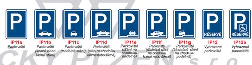 l) „Parkoviště“ (č. IP 11a až č. IP 11g), které označují místo, kde je dovoleno zastavení a stání; symboly ve spodní části značek č. IP 11b až č. IP 11g, které mohou být obráceny, vyznačují stanovené způsoby stání na parkovišti; tyto symboly mohou být vyznačeny i na dodatkové tabulce; poloha vozidla při kolmém nebo šikmém stání musí odpovídat poloze vyjádřené symbolem uvedeným na značce nebo na dodatkové tabulce; na místech, kde je dovoleno stání na chodníku, nesmí zastavit ani stát vozidlo o celkové hmotnosti převyšující 3 500 kg, jednonápravový traktor, motorový ruční vozík a pracovní stroj samojízdný;4) značky č. IP 11a až č. IP 11c, č. IP 11f až č. IP 12, č. IP 13b a č. IP 13c ukončují platnost značek č. B 28 a č. B 29,