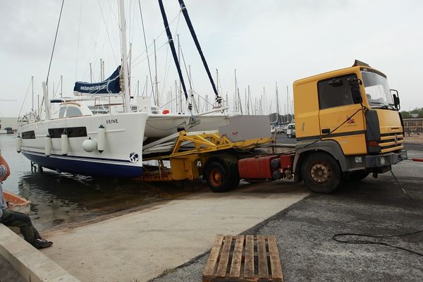 Při opětovném tahání plavidla na břeh si vybraný personál omočí nohy, když v sedě na návěsu podjedou katamarán a před vyzvednutím hydraulické plošiny štelují pečlivě opěrné špalky do optimálních poloh.