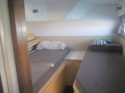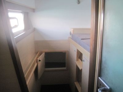Zcela na přídi jsou pak maličké kajutky pro personál plavidla (u plavidel podobné kategorie se běžně charterují lodě se skipperem a hosteskou), vybavené velmi spartánsky s holým laminátovým interiérem a vstupem z paluby. Ve všech ubytovacích prostorách je množství praktických úložných prostorů, pouze šatní skříňka je poněkud nižší a bibsy nebo kombinéza se v ní rozhodně vyvěsit nedá. Jak by se u francouzské lodi dalo očekávat, salon oplývá odkládacími místy na drinky a úložnými místy na láhve.