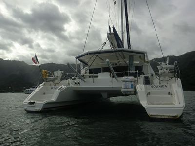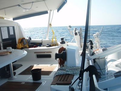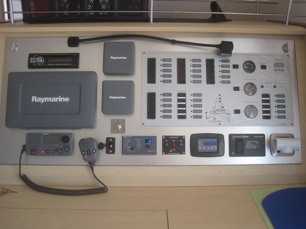 Samozřejmostí je na palubě přípojka 12 V a tlumitelné osvětlení panelu. Napětí 220 V je k dispozici ze zásuvek po celé lodi pouze při připojení kabelem v přístavu na síť nebo při zapojení generátoru. Salon je vybaven rozměrným jídelním stolem a pohodlnou rozebíratelnou pohovkou s koženými potahy a úložnými prostory pod sedáky. Širokými posuvnými dveřmi, které se u téměř všech katamaranů na světě zajišťují a zavírají zcela vylízaným, nepraktickým a poruchovým mechanismem se dostaneme na „dvoreček“ plavidla, kde se nacházejí další odpočivné prostory a pod nimi další skladovací prostory. Zcela na zádi uprostřed se pak nachází pedestal s motorovým a manuálním winchem (pochopitelně bylo nutno pro funkci motorového winche zapnout generátor), kormidelní konzoly, motorové prostory, schůdky a konečně voda. Vedle pedestalu s winchi jsou šikovně vymyšlené prostory na uskladnění lan s poklopy sloužícími jako sedátka a stopery s winchi na vytahování gumového člunu na „davit“ – malý dvouramenný člunový výložník. Life raft je uložen v nerezovém rámu za zádí u pravého plováku.