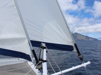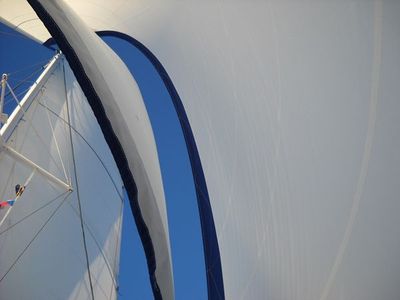 Superlativy pak zaslouží jednoznačně sestava genakru o ploše 90 sqm a o něco útlejší kosatky. V pasátových větrech se mezi oběma plachtami vytvářely učebnicové aerodynamické jevy provázené hvízdáním v lanoví a nadšeným povykováním posádky sledující na logu rychlost lodě šplhající mezi vlnami až k 18 uzlům. V zadobočním až zadním větru pak genakr vyložený od čelenu přes polovinu šířky katamaranu vzbuzoval v některých členech posádky nostalgické vzpomínky na dobrodružství se spinakrem na Liptovské Šíravě. Otěžový rail genakru je vyložen až k samému okraji paluby, kosatkové otěžě pak vedou do kladek v railech na střeše salonu, aby bylo možno kosatku více přitáhnout a vylepšit tak vlastnosti v jízdě proti větru. Podle refovací tabulky by měl přijít první ref – tedy redukování plochy plachet – při 23 kn rychlosti větru, na poslední červený ref a bez kosatky je pak tabulce vyznačeno 55 kn+, což nikdo z posádky neplánoval vyzkoušet. Refovací systém je asi jeden z nejlepších existujících, ze stěžně vedou ovládací lana pod palubou na záď, hlavní plachta se ovládá zvlášť zadními a zvlášť předními (cunninghamovými) refy a pochopitelně výtahem.