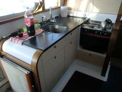 Salon přitom zahrnuje i kuchyň a navigační stolek. Kuchyň je velkorysá se zastavěnou troubou, mikrovlnkou (sloužící nám jako sklad koření), ledničkou a odděleným na lodní poměry velkoobjemovým mrazákem. Na polynéského domorodce provádějícího inspekci plavidla na přítomnost invazivních organismů a biologického materiálu při vstupních formalitách, pak mrazák účinkoval až hypnoticky přitažlivě, zvláště, když v něm trůnila francouzská kachna. Zabavení kachny jsme se vyhnuli opět pouze invazí do již notně zdevastovaného pivního fondu. Plynový sporák je optimisticky umístěn napevno bez závěsu, což zdramatizuje proces vaření jen vyjímečně. Velká dvacetilitrová plynová láhev trůní pod venkovní sedačkou což důmyslně zkracuje rizikové plynové vedení. Sluneční panely na střeše při pěkném počasí utáhnou právě tak autopilota a samotnou ledničku a na svým umístěním na přístřešku nijak neruší.