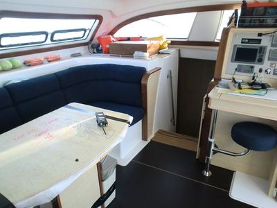 Vzhledem k charakteru plavby ponecháváme ochranné papundekly všude kde to jde, i přesto je estetický zážitek z interieru lodě uchvacující. Všude vládnou kvalitní materiály se solidním zpracováním, design interiéru je střízlivý, praktický a nikterak stylově vyhraněný. Drobnou výjimkou a zároveň mojí osobní tragédií byly nízké vstupní dveře do salonu o jejichž horní hranu jsem si zpočátku opakovaně demoloval hlavu, než došlo k olepení pěnovou izolací na hadice. Podobný efekt měla hrana stěny u schodů z kajuty do salonu, jejíž design byl pečlivě vyladěn k zásahům do brňavky. Zbytek pochopitelně nemá chybu a např. ovládací panel evokuje hvězdné války, s blikajícími displeji topení a klimatizace, dobíjení, generátoru, elektrické bilance, stavu paliva, pitné a odpadní vody, VHF radiem, obrazovkou navigačního plotteru, spínači navigačních a vnitřních světel a dalších elektrických okruhů lodi, přičemž vše vyžaduje podrobné seznámení, neboť je vše francouzsky a místo portside/starboard máme babord/triboard. Vtipně jsou vyřešeny kontrolky navigačního osvětlení umístěné na stylizované kresbě lodi na svých reálnýc pozicích.