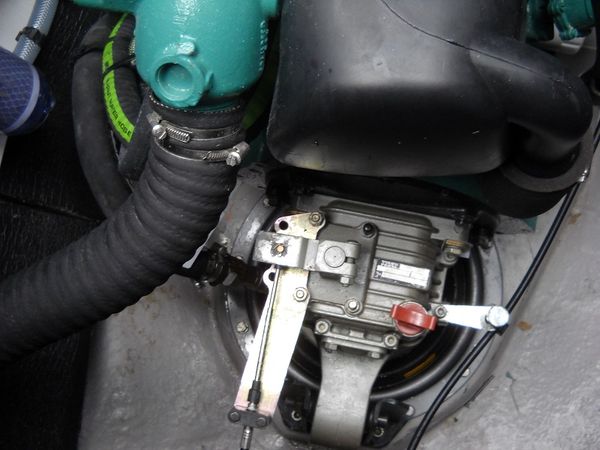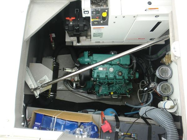Schůdky a ostatně celá paluba jsou pokryty báječným novým teakovým povrchem, který za pár měsíců nabere senzační vyšisovanou patinu. Pod výklopným, zvukově izolovaným krytem brumlají ve velkorysých prostorách dieselové motory Volvo Penta o výkonu 40HP obklopené agregáty a připojené na převodovky ZF saildrive. Zásoby paliva jsou uloženy ve třech nádržích po 200 l. Přístup k nádržím je v podlaze pod venkovním stolem, pod který je nutno při tankování se jakse vecpat. Ve vodě se mrskají dvoulisté vrtule po několika měsících obrostlé řasami. Ovládání motorů i převodovky provedeno klasicky lanovody.