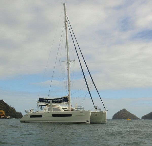 Stejně jako standardní katamarany Catana nemá zadní stěh a jeho funkci plní boční vanty posunuté hodně vzad spolu s geniálním systémem dvojité otěže hlavní plachty, z nich jedna může v pasátových větrech sloužit jako improvizovaný preventer. Na rozdíl od multihullů jiných značek je ovládání lodi soustředěno k zádi, kde zpod paluby ústí k nástavbě, na které jsou umístěny winche, refovací lana přední i zadní, výtah hlavní plachty, topping lift a i obě kladkami zpřevodované otěže hlavní plachty rozkročené do tvaru písmene A. Plachta je s klasickým stahováním rail systémem, s receptacly nasazenými na spíry (výztuhy) plachty. Dlužno hnidopichovi podotknouti, že lazy jacky (vodící lanka mezi kterými se spouští hlavní plachta) byly vyvázány bez mezikladek a jejich ovládání tedy nebylo zcela hi-fi.