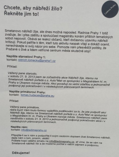 O co jde? Partička z Auto*Matu a dalších flexibilně vytvořených odnoží v rámci občanské společnosti usoudila, že je třeba udělat něco velkého a hodlá dosáhnout uzavření Smetanova nábřeží pro individuální automobilovou dopravu. Budoucím posláním této dopravní spojnice budiž městské korzo. Chodci, kteří tam již nyní mají velkoryse pojaté chodníky, se tam budou procházet protože proto. Kdyby se to někomu zdálo málo, tak je to pouze součást programu „Ladíme Prahu“, při kterém vám vybraní architekti a „odborníci na veřejný prostor“, představte si co chcete, předelají vaše město ať chcete nebo ne. No prostě paráda.