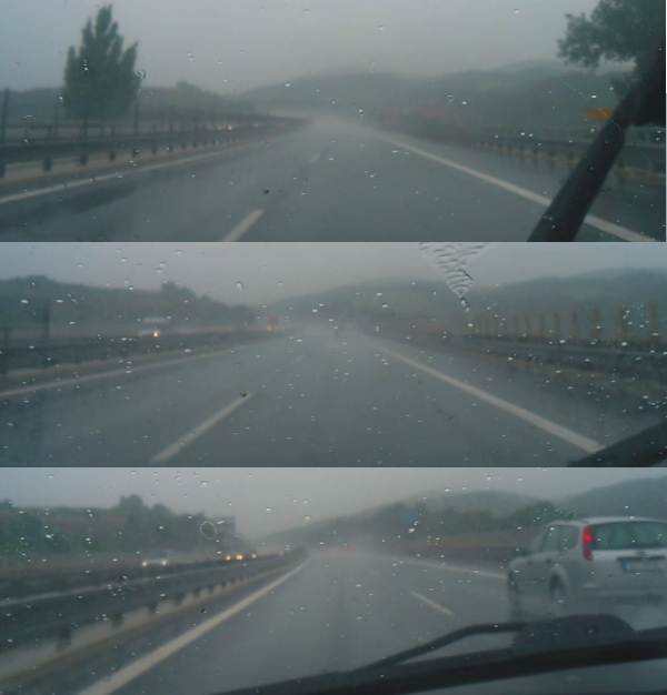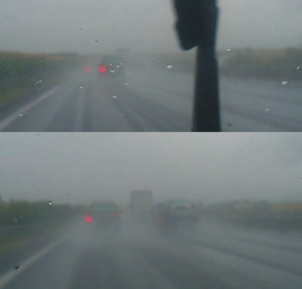 Na dálnici za sebou v takovém počasí auta nechávají charakteristický vír kapek vody a stávají se tak zezadu skoro neviditelná, obzvláště při šedé barvě.  Mlha ale nebyla natolik hrozná, aby byly třeba mlhovky při jízdě v nižší rychlosti na okreskách, takže méně bystří řidiči na mlhovky ani nevzpomněli.