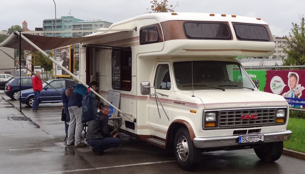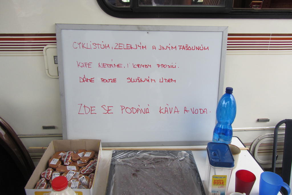 V místě dojezdu došlo k tradiční konzumaci perníku, který dodala moje žena a Behemot. Dále byla k dispozici perníková autíčka, protože my auta přece žerem. K dispozici bylo dále nějaké to občerstvení včetné teplé kávy, které z amerického krajně neekologického obytného vozu servíroval jeden z účastníků s tím omezením, že cyklofašisté nedostanou nic, ani kdyby prosili. Jeho výsuvná pergola nám přišla velmi vhod. Protože tou dobou pršelo i v Mělníku, odebrali jsme se do retaurace (Oskar klub v Neratovicích) nepatrně dříve, nežli bylo plánováno.