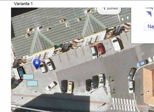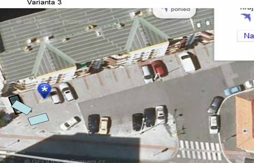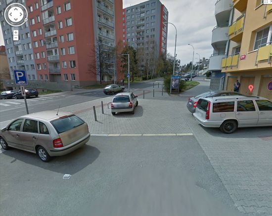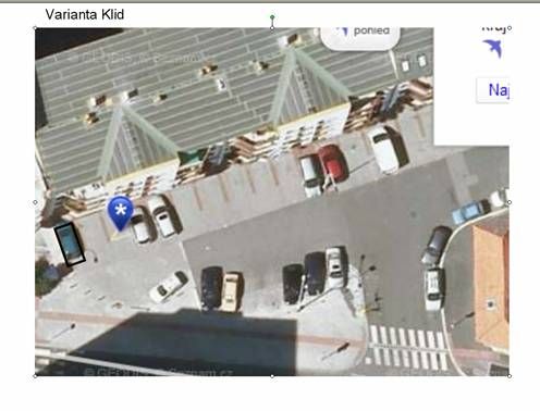 Auto v černém obdélníku je moje, stojí na správném parkovacím stání před garáží. Všimněte si malých teček rozesetých do oblouku, od telefonní budky k zaparkovaným autům. Je to „plot“, který vyznačuje manipulační plochu před garážema a není to parkoviště. Vedle nich stojí zaparkované nějaké auto. Potud by to bylo v pořádku, i když to auto tam už stojí tak na hraně, ale nikomu nikdy nepřekáželo, a byla nepsaná a nevyslovená dohoda, že tam se stát může.