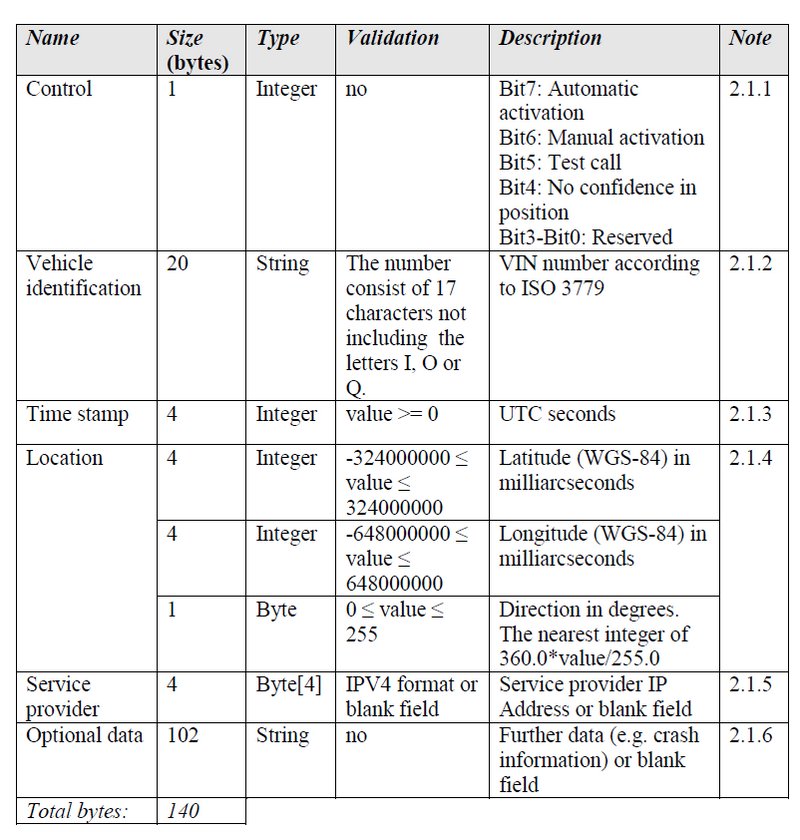 Odesílané údaje jsou: Zeměpisná délka a šířka místa události, směrový vektor (!), časové razítko, VIN číslo vozidla, zda došlo k manuální nebo automatické aktivaci a 102 bytů zůstalo zachováno na „optional data“, aniž by bylo zřejmé, co to bude. Celková délka této základní hlášky je 140 bytů. Pro zájemce je tu detailnější popis.