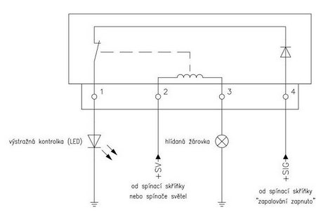 – pokud bude signalizační kontakt relé napájen ihned po zapnutí zapalování, pak vás kontrolka upozorní na nerozsvícená světla; zároveň to slouží ke kontrole činnosti – po zapnutí světel musí kontrolka zhasnout