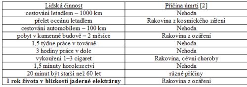 V další tabulce jsou uvedeny některé lidské činnosti s pravděpodobnosti úmrtí rovné jedné milióntině. Je z ní patrno, že člověk si často a dobrovolně zahrává s nebezpečím mnohem víc, než když staví jaderné elektrárny.