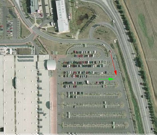 Jak to bylo? Jel jsem do Globusu nakoupit. Blížil jsem se nákupnímu zážitku po příjezdové komunikaci ve směru červené šipky. Po pravé straně jsem zaregistroval jiný automobil jedoucí ven z parkoviště ve směru zelené šipky, zastavil jsem tedy a čekal, až tento automobil vyjede. Učinil jsem tak ze dvou důvodů: