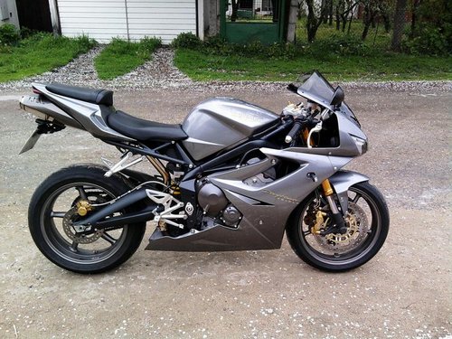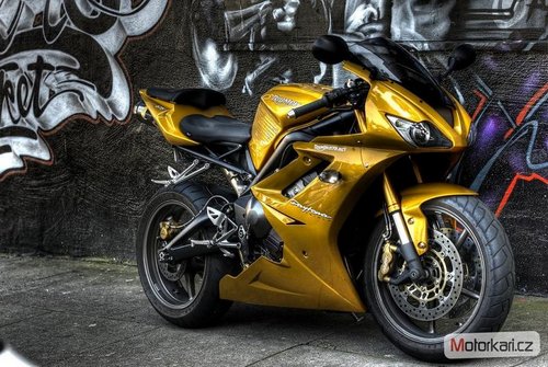 No nic, zpátky na zem. Samozřejmě se jedná o motorku. Triumph Daytona 675, r. v. 2007. Designově propracovaný kousek s kapalinou chlazeným řadovým tříválcovým motorem, 125 koňmi a 73 Nm při 11 750 otáčkách za minutu s pohotovostní hmotností 165kg, což z ní dělá pěkně mrštnou kočičku. To se potvrzuje i ve srovnávacích testech, kde má oproti ostatním šestistovkám mírně navrch. Zejména co se týká pružnosti motoru. Někdo může namítat, že objem válců není 600, ale 675. Ale co, můžu oponovat tím, že má o válec míň. Právě to jí dělá jinou a vyjímečnou oproti japonské drtivé konkurenci. Motor táhne pěkně od spodních otáček až po vrchol. Žádné výkyvy, žádné kopance během závratného letu ručičky otáčkoměru.