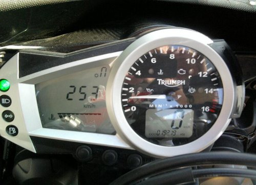 Malý odstaveček bych také věnoval budíkům. Je zde plno užitečných věcí. Začíná se samozřejmě hodinami, aktuální spotřebou, následuje dlouhodobá průměrná spotřeba, denní počítadlo kilometrů, průměrná rychlost, top speed a šikovnou věcí je také ukazatel zařazeného rychlostního stupně. Prává část budíku se kromě otáček a aktuální rychlosti věnuje také celkovému počítadlu ujetých kilometrů a dalším dvou denním počítadlům. A nakonec jedna vychytávka pro okruháře. Budíky umožňují využít také laptimer. Po zvolení tohoto módu se startovací tlačítko motoru na pravé části řidítek automatický mění v tlačítko stopovací.