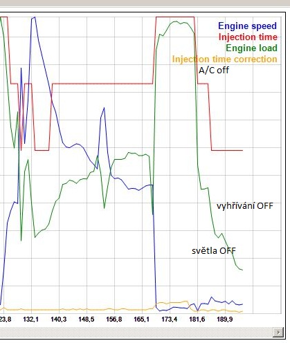Doba otevření vstřikovacích ventilů vzrostla z 3 na 5ms. Korekce doby otevření se uplatnila minimálně a držela se někde kolem 0,55 ms, takže ji pro další úvahy zanedbáme. Vidíme, že se zapínáním spotřebičů zátěž motoru rostla a s ní také doba trvání impulsů palivových ventilů, přičemž řízení motoru realizovalo stále stejné otáčky.