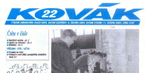 Komunistické podzemní periodikum se jmenuje Kovák, týdeník odborového svazu Kovo, je ze 3.6.2004 a stojí 6Kč. Za cenu jedné ruličky toaletního papíru dostáváte vysoce hodnotný hořlavý časopis tištěný v kombinaci modré a černé barvy.