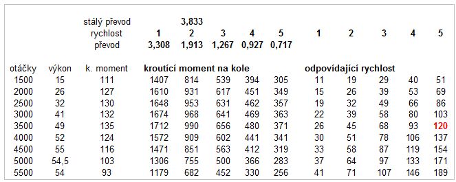 2. Jak je patrné z tabulky, čím vyšší máme zařazenou rychlost, tím menší kroutící moment máme na kole a tím hůř akcelerujeme. Nic nového, že?