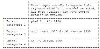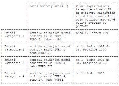 Prováděcí toaletní kodex č. 56/2013 Sb. stanoví rozdělení vozidel do emisních kategorií. Emisní kategorie nejsou totéž co emisní třídy uvedené v technickém průkazu, emisní kategorie definuje výše zmíněný předpis. Obecně se dá říci, že kategorizace bere jako prioritní měřítko emise pevných částic, což vyústilo v rozsáhlejší dopad na vozidla se vznětovým motorem.