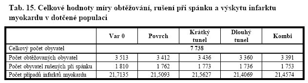 Pokud jde o hluk a jeho následky, ty mohou být různé. Špatně spíte, obtěžuje vás to a nakonec vás mrdne. V případě nulté varianty bude hlukem obtěžováno 3513 obyvatel a při povrchovém omezování 3412, tedy o celých 101, o 2.87% méně. 1810 lidí špatně spinká při nulté variantě po dopravním zklidnění jich bude 1762, tedy o celých 48 méně. A pozor, hrozí také infarkt myokardu. Při zachování současného stavu utrpí srdeční mrtvici během desetiletého pobytu v okolí magistrály a v důsledku dopravy tam 21,71 občana, zatímco při povrchovém omezování 21,51 občana. Těch zhruba 40-50 tisíc řidičů, co se budou vztekat někde v zácpách nebo chytnou v MHD lepru, není započteno; každopádně přejeme 0,2 občanovi ze vzorku výše zmíněných 7738 občanů pevné zdraví.