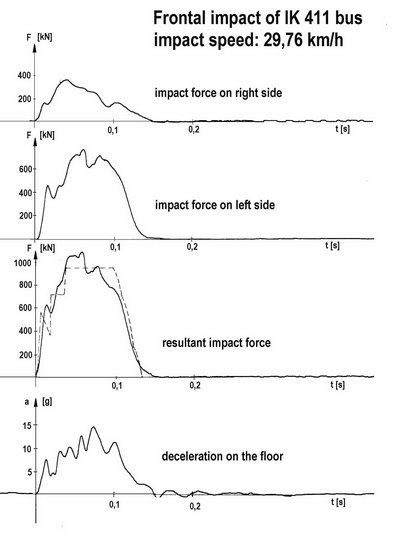 Jak vypadá náraz autobusu do pevné překážky v rychlosti 30 km/h? Jen pro zajímavost jeden graf, abychom viděli, o jakých silách a zrychleních tu hovoříme: