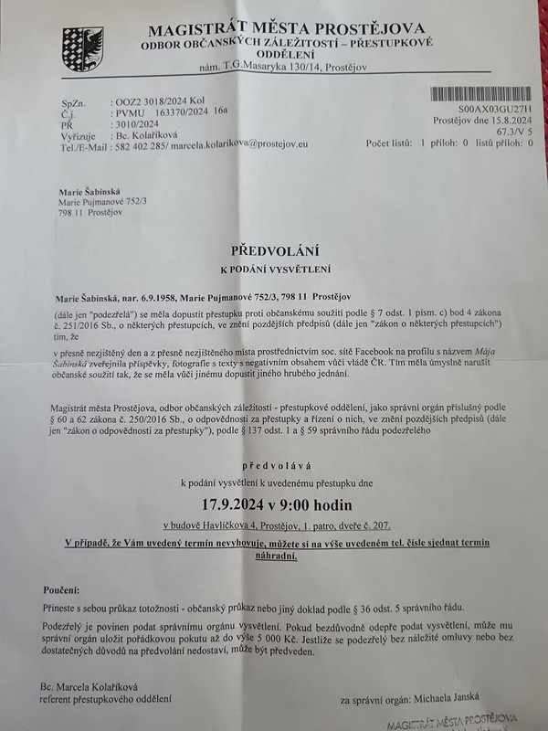 Takhle nějak to je se svobodou projevu v ČR. Předvolána k podání vysvětlení za narušení občanského soužití tím, že zvěřejnila příspěvek s negativním obsahem vůči vládě.