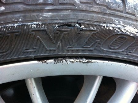 Pri výjazde z parkoviska na hlavnú cestu sa kvôli rôznym okolnostiam nedalo ísť úplne vpravo, ale bola nutnosť sa pripojiť na hlavnú viac stredom cesty. Nič nejde, pohýnam sa , zrazu šupa asi po 2 metroch jazdy. Vedel som, že sa jednalo o výmoľ, ktorý som vopred videl a snažil som sa mu maximálne vyhnúť, no nečakal som, že bude mať veľkosť menšej uhoľnej bane. Výmole triafam, aj keď nerád, denne, tak ako 99% šoférov v našich končinách, no po tomto som zbledol. Po pár metroch auto začalo strašne vibrovať a od zadnej nápravy sa ozýval pravidelný buchot. Modlil som sa , nech to nie je ohnutý disk, či niečo horšie. Nakoľko som už bol na dvojprúdovej hlavnej ceste, ktorá po 30 metroch ústila na kruhový objazd bez možnosti bezpečného odstavenia, rozhodol som sa pomaly, asi 10 km/h prejsť na najbližšie voľné bezpečné miesto, to som našiel asi 300 metrov za kruhovým objazdom, 100 metrov pred mojim domov. Auto som odstavil a nemal som odvahu vyjsť von. Po zbežnej obhliadke som narýchlo zbadal prerazenú pneumatiku a ohryzený disk. Disk sa javil rovný a popravde nečakal som, že guma bude deravá. Teraz už viem, že po prerazení pneu profilu 35 človek len minimálne zbadá, že sa niečo s pneu deje.