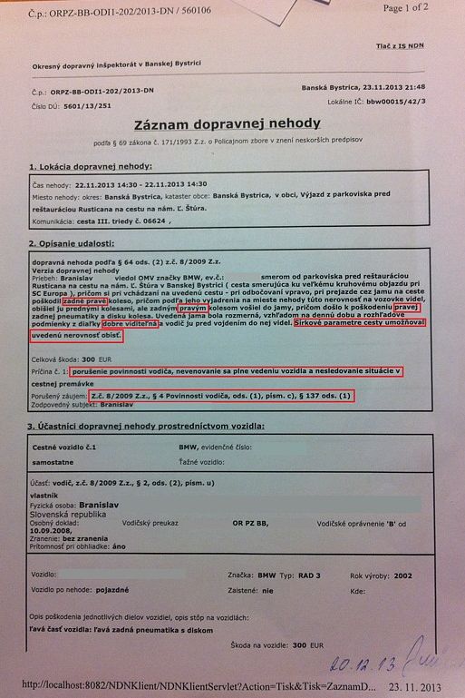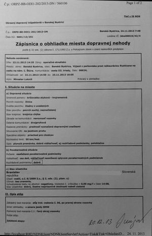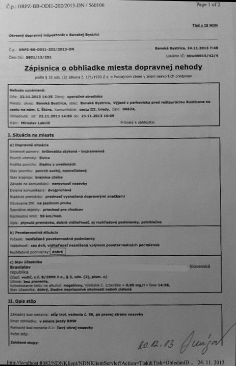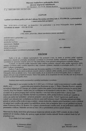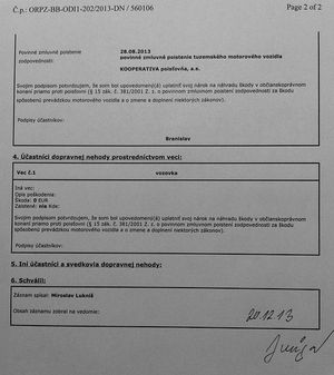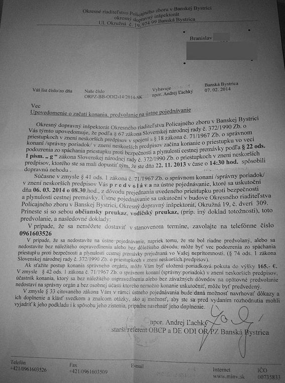 O 6 týždňov telefonát, či som ochotný sa dostaviť na podanie vysvetlenia, ja som súhlasil. Táto fáza už bola celkovo nejaká divná a oficír mal odstup a nehovoril skoro nič. Ja som mu mal nadiktovať ako sa to stalo a on to spísal. Ja, nevedomý či som niečo na seba nepovedal, čo by bolo použité proti mne, som ten papier asi po 100 násobnom prečítaní podpísal, Medzi rečou mi podporučík povedal, že nech hodím ešte podpis aj na „tieto 2 papiere“, pýtam sa, čo to je a či si to môžem pred podpisom aspoň prečítať. Nerád, ale povedal, že môžem. Čítam si to a skoro som sa tam neudržal, zistil som ,že toto je tá fáza, kedy si človek poserie život. Mimo iného tam bolo spomenuté, že som vinný za dopravnú nehodu a svojim podpisom teda s tým súhlasím. Toto som rázne odmietol podpísať , pozdravil som a dohodli sme sa, že Ďalšia komunikácia bude korešpondenčne.