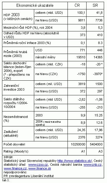 3. Kvalita, stabilita, přidaná hodnota, export – na rozdíl od Slovenska se můžeme radovat z poměrně příznivého vývoje českého exportu. Podle posledních statistických údajů český export se vyvíjí rychleji než import a rovněž se mění i struktura vyváženého zboží: zatímco dříve to byly hlavně suroviny a zboží s nízkou přidanou hodnotou, nyní (zvláště po otevření trhů EU a odbourání celních bariér) se naše zboží těší stále větší oblibě v zahraničí. Negativní saldo zahraničního obchodu je přitom zejména na vrub obchodu s rozvojovými státy a Čínou, kam prakticky nic moc nevyvážíme. Rovněž v objemu zahraničních investic na hlavu je Česko lepší než Slovensko opět o cca 30% a to navzdory rozhodnutí korejských automobilek. Rovněž hodnota inflace, která je v ČR 0,1%, zatímco na Slovensku 8,3% (před zavedením rovné daně) jasně dokumentuje stabilitu ekonomického prostředí v ČR proti SR.