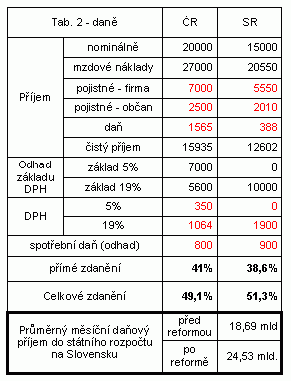5. Úroveň zdanění. Zdanění je jedním z nejčastěji citovaných parametrů, který brzdí ekonomický rozvoj. Pojďme se tedy podívat, jaká je úroveň zdanění a jeho distribuce v jednotlivých zemích po rozpadu Československa. Obě země začínaly na stejném systému daní, které zavedla ještě federální vláda, hlavním strůjcem daňového systému obou zemí byl Václav Klaus. V České republice se od daňové reformy okolo roku 1990/91 změnilo máloco, trochu klesly daně z příjmu právnických osob a trochu stouply odečítatelné položky rozhodné pro výpočet daně z příjmu FO, trochu klesla DPH. Úroveň zdanění je nejvyšší u lidské práce, kde přetrvává efektivní zdanění průměrného platu (20000) včetně povinných odvodů okolo 41% (celkové náklady na mzdu jsou 27000 Kč). Daně jsou progresivní s maximální sazbou 32%, ale je zde omezení vyměřovacího základu pro platbu zdravotního a sociálního pojištění na 486000 Kč měsíčně, takže „top salaries“ jsou paradoxně zdaněny méně. Celkově lze konstatovat, že progresivita daňového zatížení je menší, než v leckterých zemích EU (příkladem budiž Velká Británie nebo Německo). DPH si u vybraných komodit jako potraviny, vodné, stočné, elektřina, léky atd. zachovalo příznivou sazbu 5%, nákup ostatních komodit je zdaněn 19%. Dalším žroutem prostředků je institut spotřební daně, jejíž objem např. u benzínu představuje asi 1/3 – 2/5 nákladů. Ostatní daně většinou nepředstavují v životě běžného člověka podstatnější částky (15% zdanění výnosů z investic, her apod., daň z nemovitosti, daň dědická atd.) Přesto se v České republice blýská na trochu lepší časy. Od roku 2005 je účinná novela daňových zákonů ve smyslu společného zdanění manželů. To umožní řadě rodin specializaci, kdy se jeden z manželů stará o děti, zatímco druhý vydělává. Rodina tak může ušetřit i několik desítek tisíc korun na daních ročně (můj případ). To může být jistě velkým předmětem kritiky, coby upřednostňování „určité skupiny obyvatel“, nicméně pokud uvážíme, že i zmrdi, pro které jsou děti přítěží, budou požadovat po dětech ostatních občanů, aby jim platily na důchod, pak považuji společné zdanění za institut nejen ospravedlnitelný, nýbrž velmi žádoucí a podporující ony rovné šance pro všechny. Na Slovensku byla od 1.1.2004 zavedena rovná daň ve výši 19%, lze ocenit, že Slováci mají i něco podobného jako institut společného zdanění manželů, kdy si daňový poplatník odečte nezdanitelné minimum i za nepracující manželku. To je samozřejmě pozitivní zpráva ale jen do té doby, kdy si uvědomíme, že byla zavedena i rovná DPH rovněž ve výši 19%. 19% zdanění základních životních potřeb jako potraviny, léky a náklady na bydlení představují počin velmi nemravný, který vytahuje více peněz z kapes chudších občanů, protože ti na základní životní potřeby dají podstatně větší část svých příjmů, než občané bohatší. Všechny slušné státy proto mají minimálně 2-3 sazební pásma DPH – např. v Británii je sazba na potraviny 0%, protože i Margaret Thatcherová ve shodě se svým pravicovým smýšlením uznala, že zdaňovat žrádlo je prasečina, protože jíst musí každý a stát nemá žádné morální právo za to kohokoli finančně sankcionovat. Co se týče spotřební daně, ta na Slovensku rovněž existuje a to ve výši nepatrně větší, než v Česku, protože jsou v zákoně sazby uvedeny přímo v korunách, těžko se efekt takových daní odhaduje. Nedalo mi to a spočítal jsem si kolik takový běžný občan u nás a na Slovensku na daních zaplatí. Odhady jsou pouze přibližné a vycházejí z průměrného příjmu a z finančních rozvah nad strukturou výdajů rodiny. Předpokládám, že normální člověk bydlí, stravuje se, jezdí autem a sem tam výjimečně si užije nějakou zábavu, nekouří a eventuelně šetří nebo splácí dluhy (tedy neutratí všechny prachy). Ve výpočtu nebyl ve prospěch Slovenska zahrnut efekt inflace, která nemilosrdně drtí úspory všech občanů i právnických osob. Shrnutí je uvedeno v tabulce 2 a vyplývá z něj zajímavá skutečnost. Po zavedení té zaručeně nejpravicovější a nejsprávnější rovné daně (která právě proto, že je správná, morální, pravicová a jedině možná, existuje pouze ve zlomku států) zaplatí Slováci na daních podstatně více než před reformou (rozpočtové měsíční příjmy se zvýšily cca o 31%), dokonce jsou na tom tak, že jejich celkové daňové zatížení je vyšší, než v České republice, těžce zkoušené sociálním inženýrstvím ČSSD. Člověk by řekl, že uplatňování pravicových idejí v ekonomice znamená, že stát sníží svoje příjmy a tím i svoje ingerence do věcí občanů na nezbytné minimum. Dzurindovu týmu se však povedl nádherný veletoč. V zájmu celkové pravicové spravedlnosti se daňové zatížení nejen zvýšilo, ale rovněž se změnila i jeho distribuce. A tak místo aby si utahovali opasky ti, jejichž odpovědnost za stav ekonomiky je klíčová, bude si je zase utahovat nižší a střední třída, která má nejen malou odpovědnost za chod státu, ale hlavně je početnější a nemůže se bránit. Zavedení rovné daně tedy není pravicovým počinem zmenšující ingerenci státu, nýbrž pouze vohnoutí skrčka na téma kterak vybrat více daní abych se u toho moc nenadřel. Tak už to na tom světě chodí. Není pravičák jako pravičák.