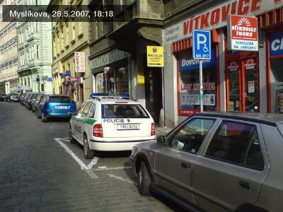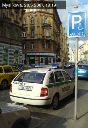 Tohle auto (určitě to bude to auto, ne řidič-policista, ten přeci ctí zákon a dokonce k tomu z pozice svého povolání ostatní občany i nutí) má zcela zjevně zálibu v parkování na invalidních místech. Před časem v Praze na Vinohradské v oblasti Nám. Jiřího z Poděbrad, tuhle zase v Myslíkově. Asi by mělo jít do šrotu, stejně, jako by poslala do šrotu ztráta řidičského průkazu mne, jakožto živnostníka. Nebo by stačilo jen nakopat rektum příslušným, z našich daní placeným, omundůrovaným darmožroutům?