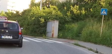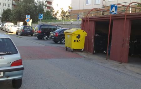 přejede dva příčné prahy, přičemž na druhý ústí chodník zpoza boudy na popelnice zprava: