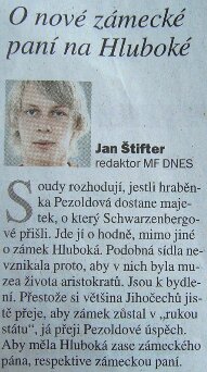 První sloupek, který mi dokonale zvedl tlak, se jmenoval O nové zámecké paní na Hluboké. Alžběta Pezoldová, adoptivní vnučka známého českého vlastence Adolfa Schwarzenberga, učinila v polovině prosince další z mnoha svých pokusů domoci se majetku rodu v hodnotě 40mld. Kč, mimojiné také zámku na Hluboké.