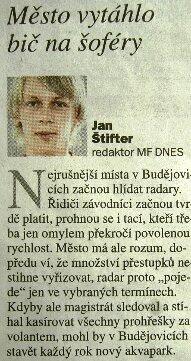 Zatímco v předchozím případě Štifter moc úcty k českému právu neprokázal, v druhém příspěvku se konečně našel v roli uvědomělého občana hajícího právo a pořádek. Druhý příspěvek, možná ne až tolik iritující, se dotýká letitého záměru českobudějovické radnice instalovat po městě radary na měření rychlosti. Dušan
