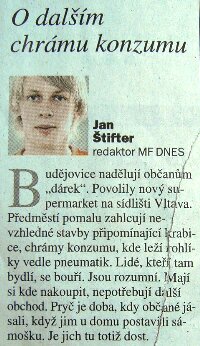předchozí bláboly. Soudruh zabrnká na alternativní strunu. Předměstí zahlcují krabicovité stavby, hřímá ani ne sedmadvacetiletý kazatel tónem starého bolševika, prý chrámy konzumu. Aby byl totalitní slovník kompletní, chybí už jen rozvraceči, váleční štváči, Yankee v cylindru a vrazi z Wallsteetu. Štifter vyčítá městu, že stavbu povolilo. No a co? Chystá se nás nadějný soudruh Štifter vrátit do doby, kdy úředníci svévolně povolují a zakazují? Temné poselství na konci článku říká, že je tady samošek dost. Dost je jich, protože to pan Štifter povídal. On je totiž naprosto geniální, předvídá i vaše nákupní potřeby. Svět podle Štiftera bude jiný, než my známe. Pokud si budeme chtít postavit obchod, anebo třeba trafiku, nebo i jen domek nebo garáž, nebude už stačit splnit zákonné podmínky pro stavbu, bude nutné schválení všemocným úředníkem, který posoudí hranatost stavby a provede rozbor, zda obdobných staveb ještě není v okolí dost, a podle toho rozhodne, zda vám ji dovolí postavit, nebo ne. Má to malý háček: V takovém světě podle Štiftera žít nechci. V takovém světě podle Štiftera chce žít jen Štifter a pár sráčů.