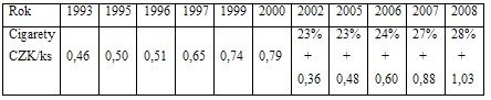 Když jsme u té ekonomiky kouření, je zde přítomna zajímavá indicie o tom, jak základní státní regulační nástroj dlouhodobě selhává. Tím nástrojem je spotřební daň. V srpnu 2008 vydal Státní zdravotní ústav zprávu, která konstatovala, že v ČR kouří 26,6% populace a tento podíl se za posledních deset let nezměnil. Jiná zpráva podobného vyznění byla vydána v roce 2009. Dá se předpokládat, že tento trend pokračuje. Následující tabulka ukazuje růst výše spotřební daně:
