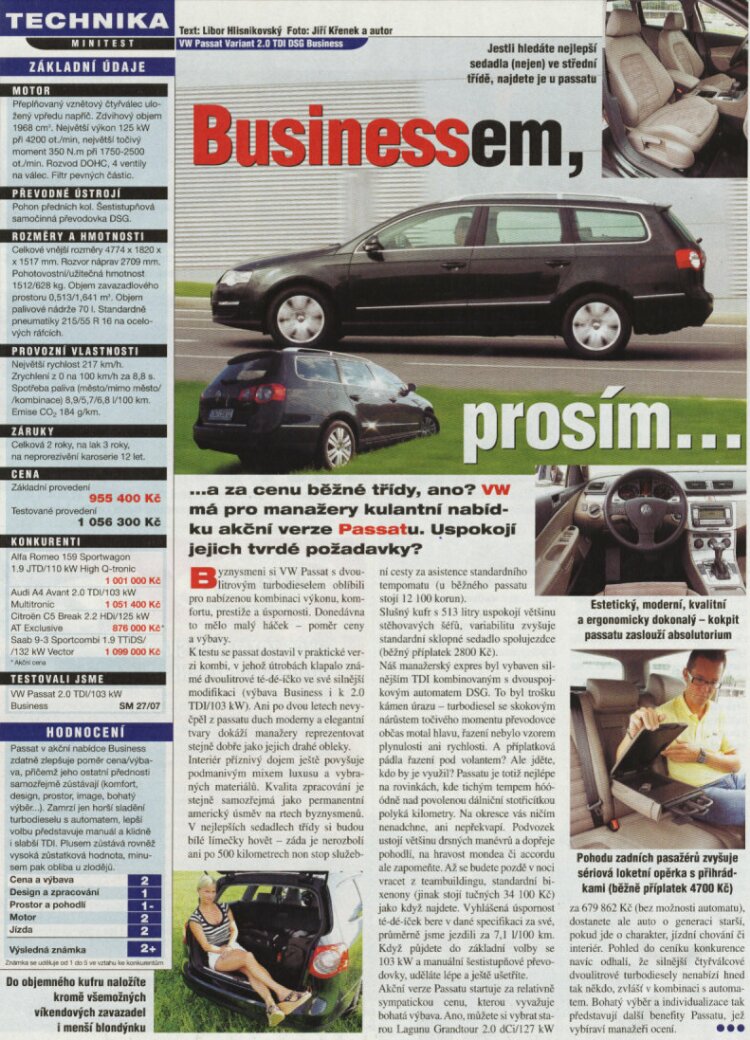 K testu mám několik menších výhrad. Kruciální fíčura Passatu Business pojmout menší blondýnku, do kufru je sice zajímavá a back-office managerky takto ve světě velkého byznysu zcela běžně cestují, to je známá věc, ale kampak se pak dají golfové hole? Co to je za test na managerský automobil, když nepojednává o umístění holí? Dál tam není nic o zásuvce na noutbúk. Sice je možné posadit si do vozu na zadní sedadlo asistenta (článek takovému pasažérovi říká „zadní cestující“) a nechat jej vyrábět pro „předního cestujícího“ proud ručně třením ocasu, ale pro managera je zásuvka na noutbúk kruciální, protože při telekon na téma workshopu o apdejtu procesní mapy se baterie rychle vybijí. Článek přehlíží význam madel na střeše, česky hagusů, ale nepochybuji, že i ty mají ve světě managementu nějaký význam, třeba se na ně na příplatkový VW Gerätehalter (Kč 24.100,- u značkových dealerů VW) dá připevnit beamer a pouštět powerpointové prezentace za jízdy na pomaleji jedoucí okolní nemanažerské vozy. Ve výbavě vozu chybí některé další manažerské doplňky, například chromovaný úchyt na bažanta, do kterého by zaneprázdněný manager během jeho mnohasetkilometrých cest tempem hoooodně nad povolenou stotřicítku močil a tím kruciálně optimalizoval svůj time management. V neposlední řadě postrádám nějakou nabídku dalšího rozšiřujícího příslušenství, který by postavení majitele ve světě velkého byznysu dále podtrhl, v tomto směru doporučuji aftermarket figurku šimpanze Business Boy za Kč 799,-