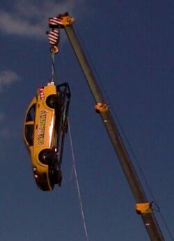 Scéna poněkud připomínala veřejnou popravu oběšením, v hlavní roli se však nenacházel žádný zločinec ani politický provokatér, jak bývá při podobných událostech obvyklé, ale žlutý automobil zavěšený pomocí jakéhosi rámu na rameni jeřábu. Tento rám jednak umožňoval visatce upevnit a jednak sloužil jako dodatečná výztuha pro případ crashtestu. Pozadí akce si mohu jen domýšlet, pravděpodobně zde šlo o to, že Chevrolet Aveo nedopadl v testech EuroNCAP příliš dobře. Řidič by byl v plechovce při nárazu rozmačkán, například by ho zasáhl volant, který se posunul o rekordních 135mm (u mnohých aut stejné kategorie se volant při nárazu 60km/h ani nehne). Taková úroveň bezpečnosti byla snad přijatelná v osmdesátých letech, je tedy s podivem, že si někdo dovolí vyrobit a prodávat takový šmejd ještě v dnešní době. Jak uvidíme, budeme nyní o osmdesátá léta zakopávat pořád.
