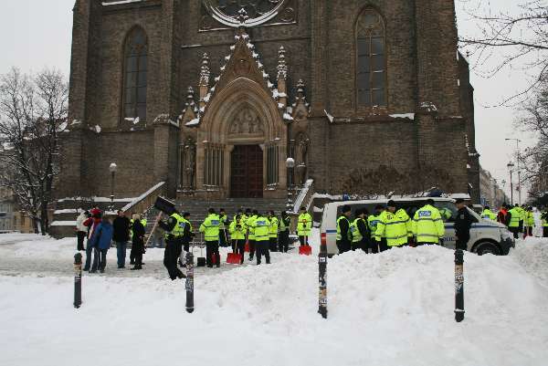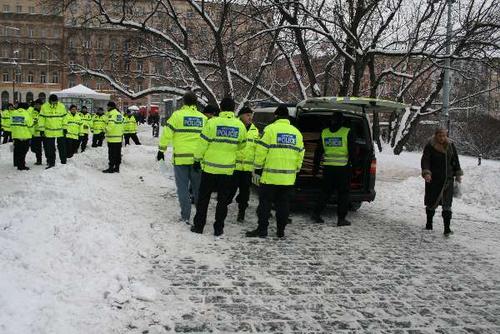 Městská policie se jako obyčejně pokouší dohnat kvalitu kvantitou. Na obrázku je zachyceno přesně 8 šoren a 24 strážníků, což naznačuje určitý organizační záměr – jednu šornu budou obsluhovat tři strážníci, což by vzhledem ke komplexitě obsluhy tohoto nástroje a inteligenci strážníků bylo přiměřené. Ani jeden nepracuje, právě provádějí meditaci. Možná se připravují sníh pokutovat za nedovolené shromažďování.