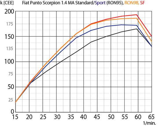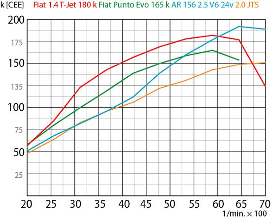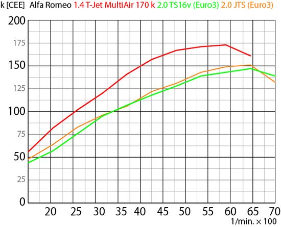Zeleně je ponechána výkonová křivka atmosféricky plněného nepřímovstřikového motoru AR 2.0 TwinSpark 16v s výrobcem udávaným max. výkonem 155 koní, oranžově je značena výkonová křivka přímovstřikového „stechiometrického“ motoru 2.0 16v JTS (výrobcem udávaný max. výkon 165 koní) a červeně je znázorněna výkonová křivka motoru 1.4 T-Jet přeplňovaného výfukovým turbodmychadlem, u něhož tentýž výrobce uvádí maximální výkon 155 koní. Motory by si tedy teoreticky měly být zhruba rovny, přímovstřikový JTS by měl mít nejvyšší max. výkon.
